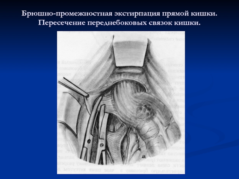 Слайд 73Брюшно-промежностная экстирпация прямой кишки. Пересечение переднебоковых связок кишки.