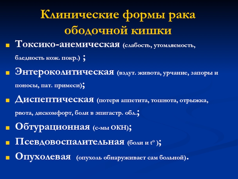 Для опухолей правой половины толстой кишки характерны: а) слабость, недомогание, анемия; б) частые запоры, испражнения в виде овечьего кала со следами крови на поверхности; в) слабость, недомогание, анемия, поносы; г) слабость, недомогание, анемия, запоры;