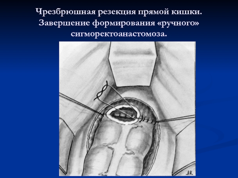Слайд 85Чрезбрюшная резекция прямой кишки. Завершение формирования «ручного» сигморектоанастомоза.