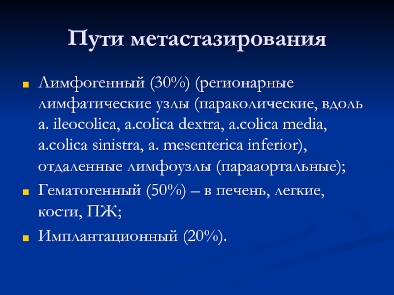 Лимфогенный (30%) (регионарные лимфатические узлы (параколические, вдоль a. ileocolica,