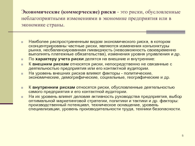 Слайд 5Экономические (коммерческие) риски - это риски, обусловленные неблагоприятными изменениями в экономике
