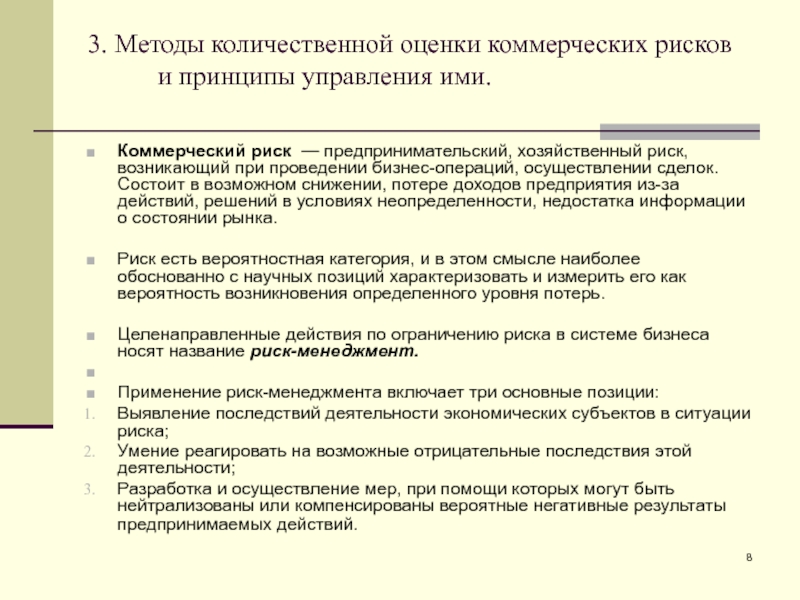 Методы количественной оценки коммерческих рисков и принципы управления ими.