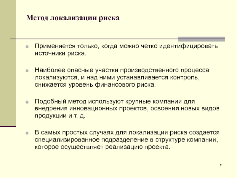 В самых простых случаях для локализации риска создается специализированное подразделение в структуре компании, которое осуществляет реализацию проекта.