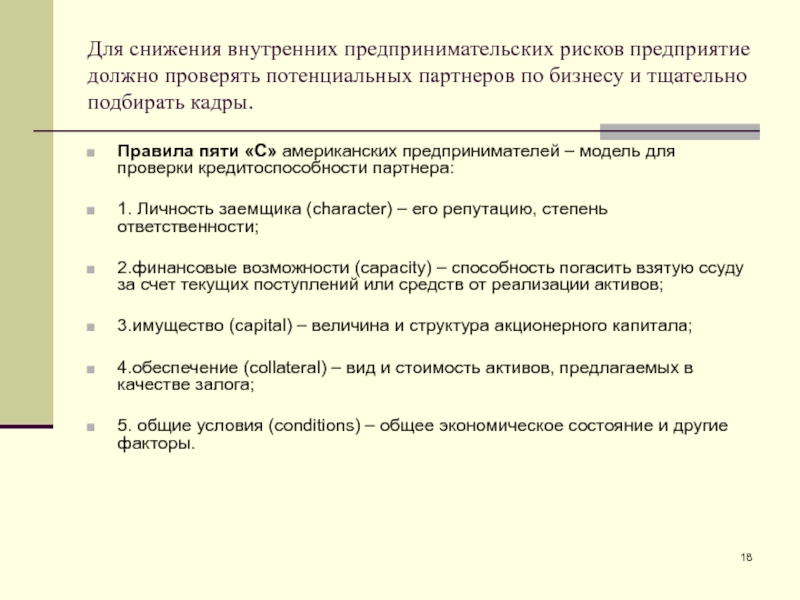 Слайд 18Для снижения внутренних предпринимательских рисков предприятие должно проверять потенциальных партнеров
