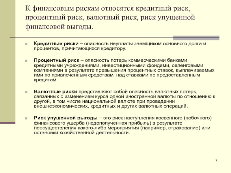 Слайд 7К финансовым рискам относятся кредитный риск, процентный риск, валютный риск,