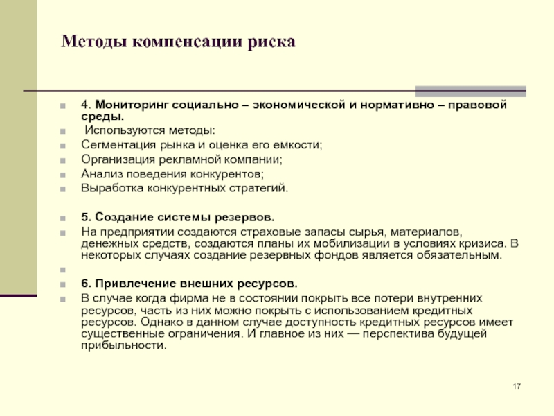 Разработка и осуществление мер, при помощи которых могут быть нейтрализованы или компенсированы вероятные негативные результаты предпринимаемых действий.