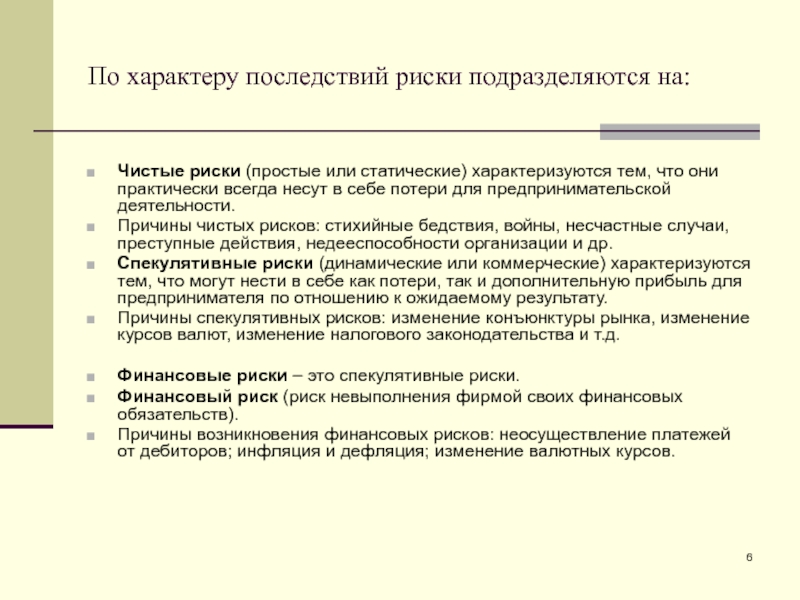 Причины чистых рисков: стихийные бедствия, войны, несчастные случаи, преступные действия, недееспособности организации и др.