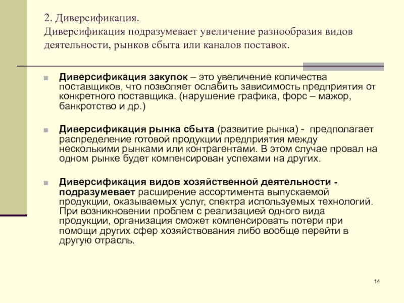 Диверсификация видов хозяйственной деятельности - подразумевает расширение ассортимента выпускаемой продукции, оказываемых услуг, спектра используемых технологий. При возникновении проблем с реализацией одного вида продукции, организация сможет компенсировать потери при помощи других сфер хозяйствования либо вообще перейти в другую отрасль.