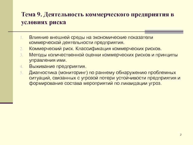 Слайд 2Тема 9. Деятельность коммерческого предприятия в условиях риска