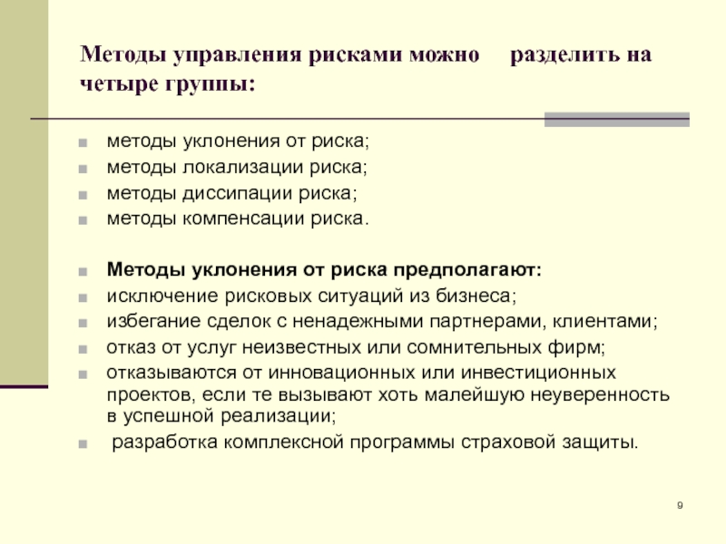 Слайд 9Методы управления рисками можно разделить на четыре группы: