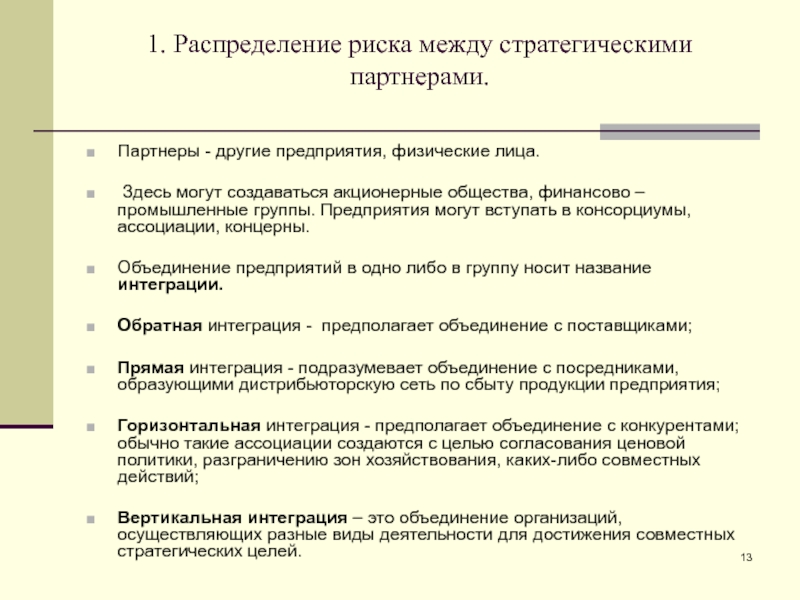 Слайд 131. Распределение риска между стратегическими партнерами.