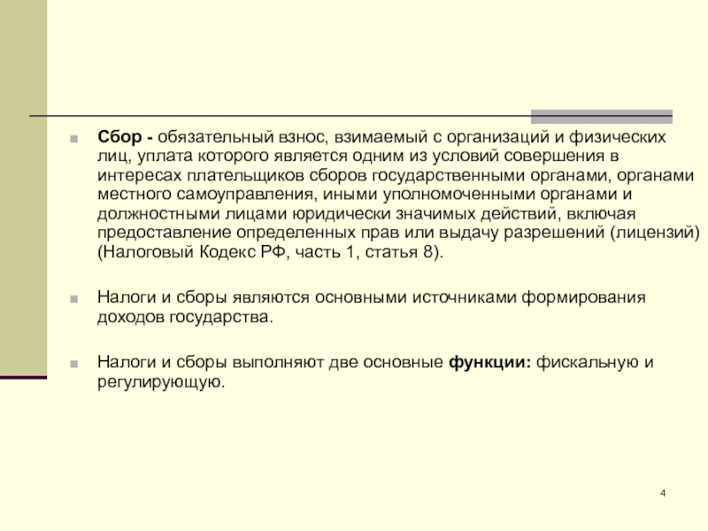 Слайд 4Сбор - обязательный взнос, взимаемый с организаций и физических лиц,