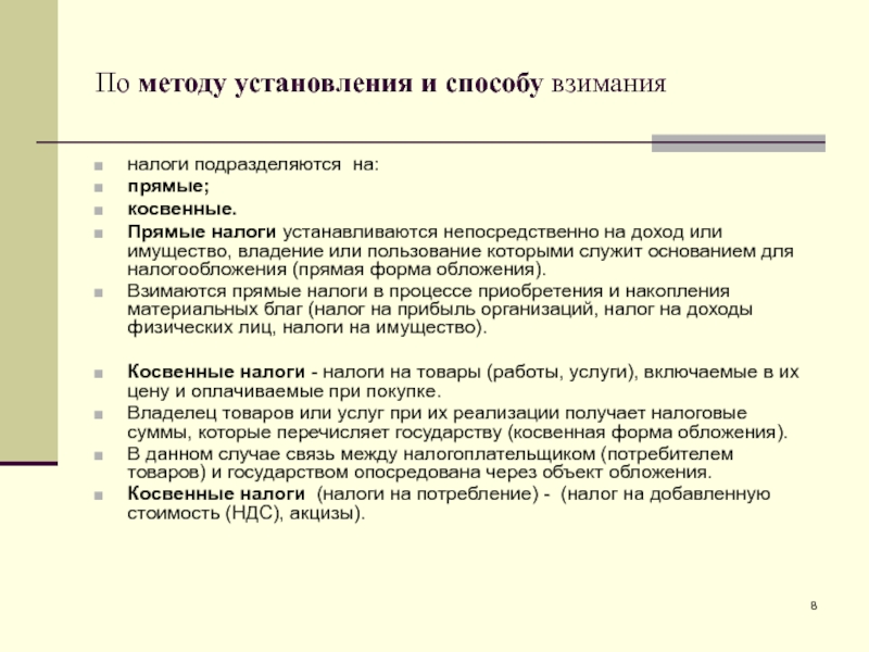 Взимаются прямые налоги в процессе приобретения и накопления материальных благ (налог на прибыль организаций, налог на доходы физических лиц, налоги на имущество).