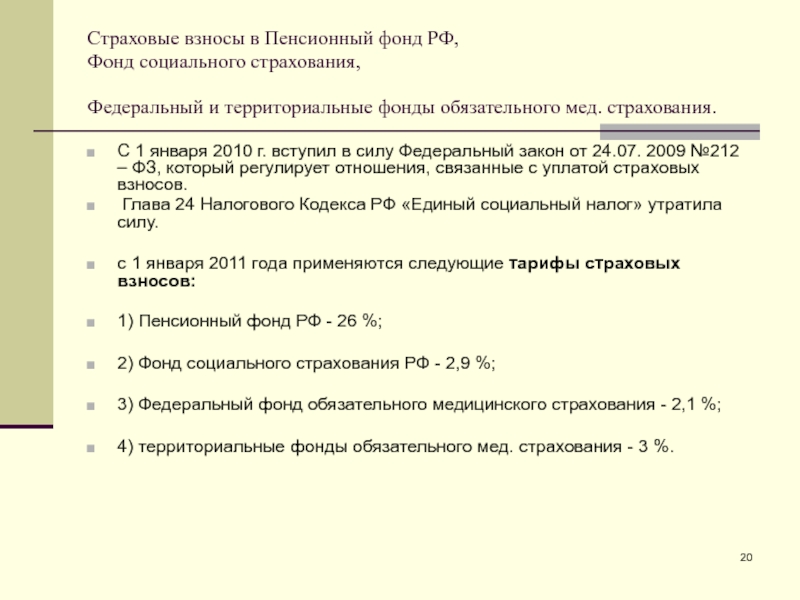 г. вступил в силу Федеральный закон от 24.07. 2009 №212 – ФЗ, который регулирует отношения, связанные с уплатой страховых взносов.