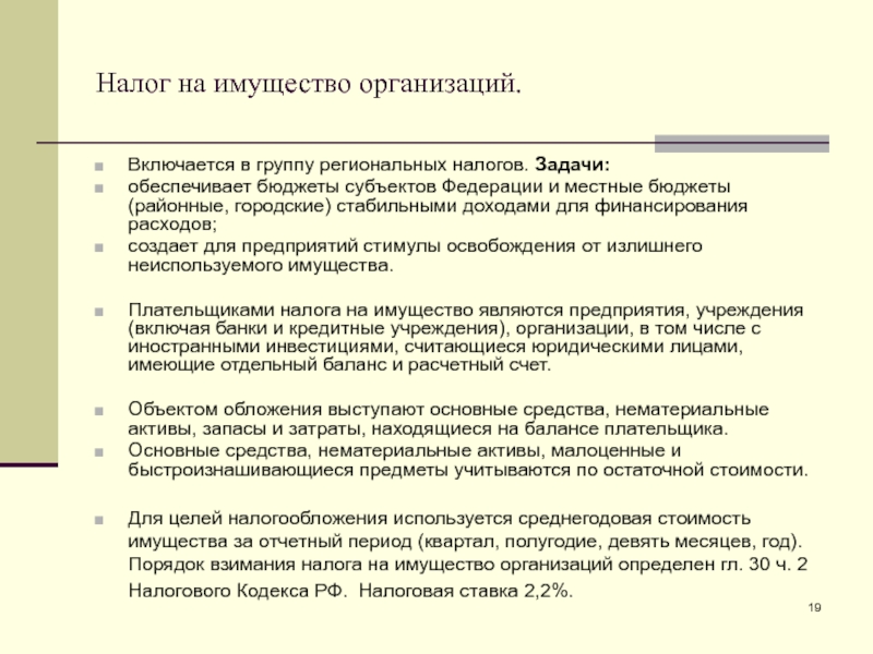 Для целей налогообложения используется среднегодовая стоимость имущества за отчетный период (квартал, полугодие, девять месяцев, год). Порядок взимания налога на имущество организаций определен гл. 30 ч. 2 Налогового Кодекса РФ. Налоговая ставка 2,2%.