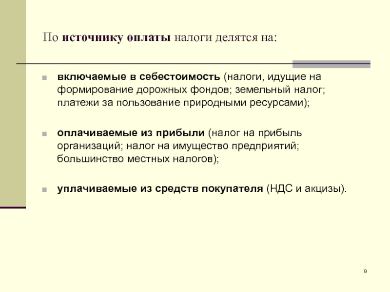 оплачиваемые из прибыли (налог на прибыль организаций; налог на имущество предприятий; большинство местных налогов);