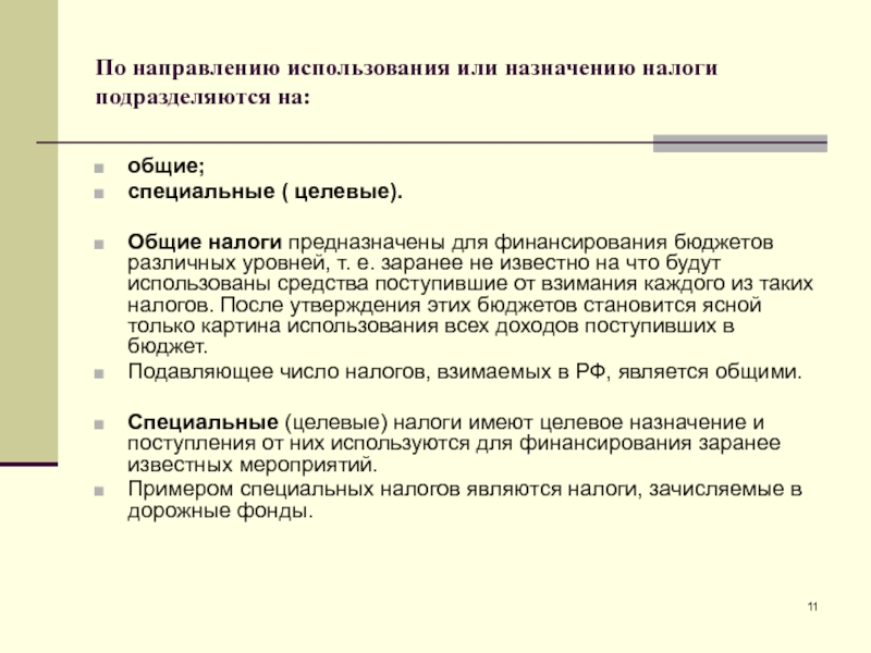 Слайд 11По направлению использования или назначению налоги подразделяются на: