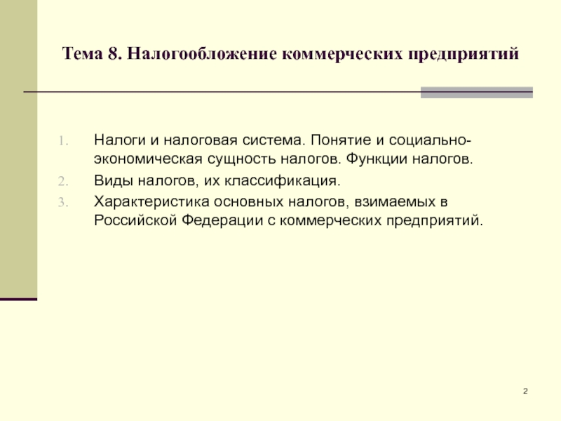 Слайд 2Тема 8. Налогообложение коммерческих предприятий