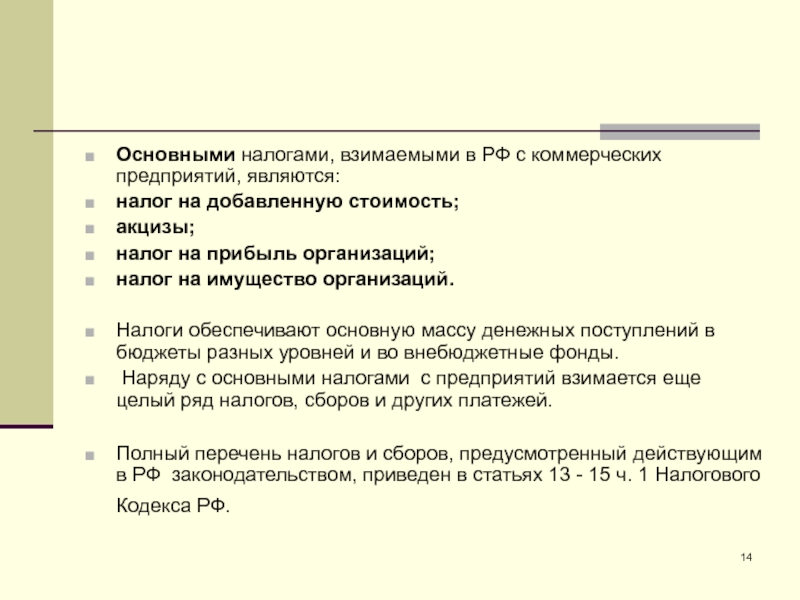 Слайд 14Основными налогами, взимаемыми в РФ с коммерческих предприятий, являются: