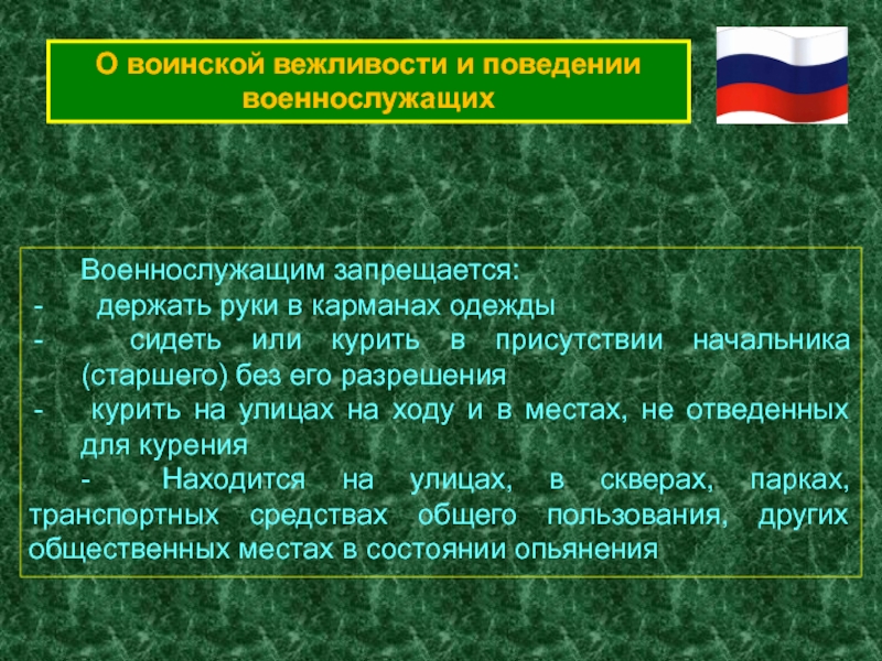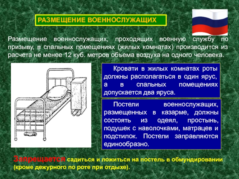 Запрещается садиться и ложиться на постель в обмундировании (кроме дежурного по роте при отдыхе).