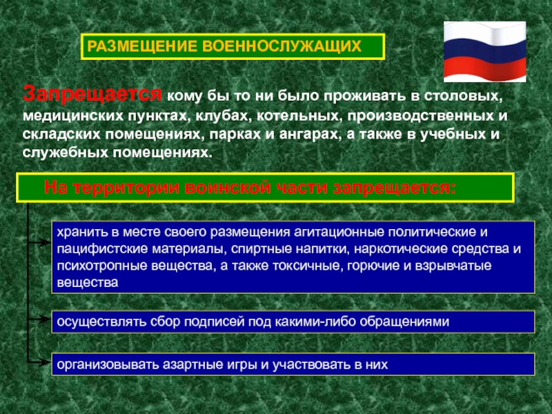 хранить в месте своего размещения агитационные политические и пацифистские материалы, спиртные напитки, наркотические средства и психотропные вещества, а также токсичные, горючие и взрывчатые вещества