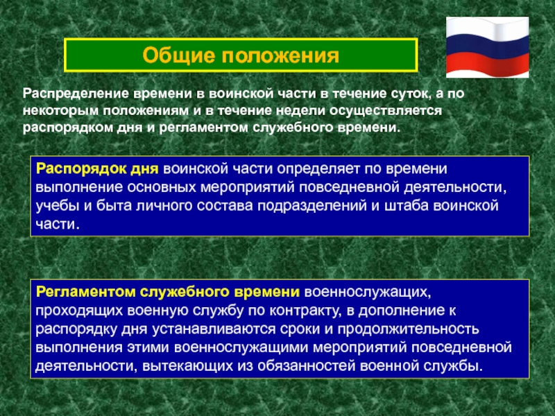 Распределение времени в воинской части в течение суток, а по некоторым положениям и в течение недели осуществляется распорядком дня и регламентом служебного времени.