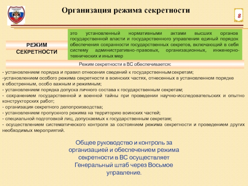 Общее руководство и контроль за организацией и обеспечением режима секретности в ВС осуществляет Генеральный штаб через Восьмое управление.