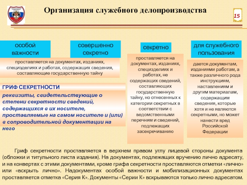 Гриф секретности проставляется в верхнем правом углу лицевой стороны документа (обложки и титульного листа издания). На документах, подлежащих вручению лично адресату, и на конвертах с этими документами, кроме грифа секретности проставляются отметки «лично» или «вскрыть лично». Надокументах особой важности и мобилизационных документах проставляется отметка «Серия К». Документы «Серии К» вскрываются только лично адресатом.