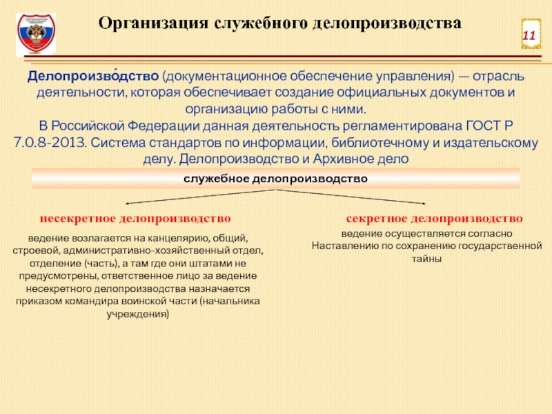 В Российской Федерации данная деятельность регламентирована ГОСТ Р 7.0.8-2013. Система стандартов по информации, библиотечному и издательскому делу. Делопроизводство и Архивное дело