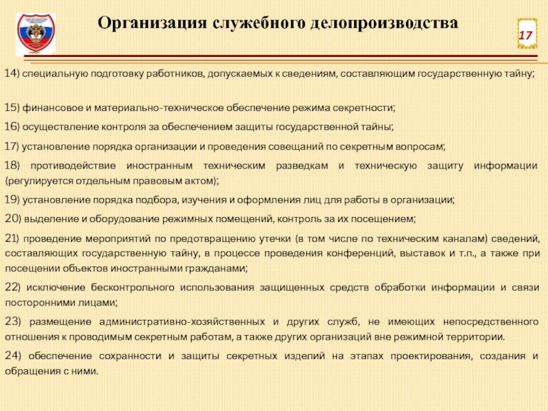 17) установление порядка организации и проведения совещаний по секретным вопросам;
