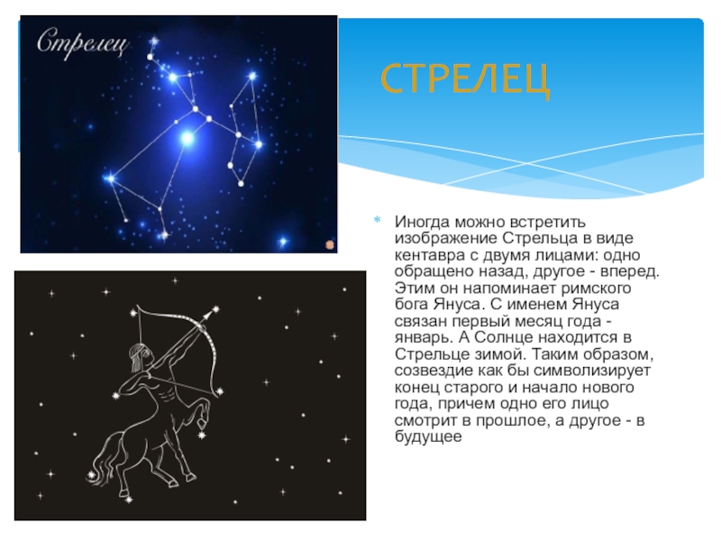 двумя лицами: одно обращено назад, другое - вперед. Этим он напоминает римского бога Януса. С именем Януса связан первый месяц года - январь. А Солнце находится в Стрельце зимой. Таким образом, созвездие как бы символизирует конец старого и начало нового года, причем одно его лицо смотрит в прошлое, а другое - в будущее