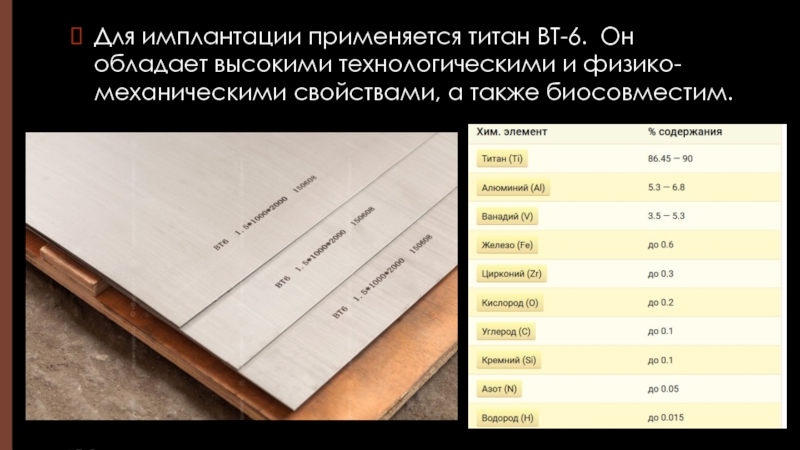 Слайд 4Для имплантации применяется титан ВТ-6.  Он обладает высокими технологическими и