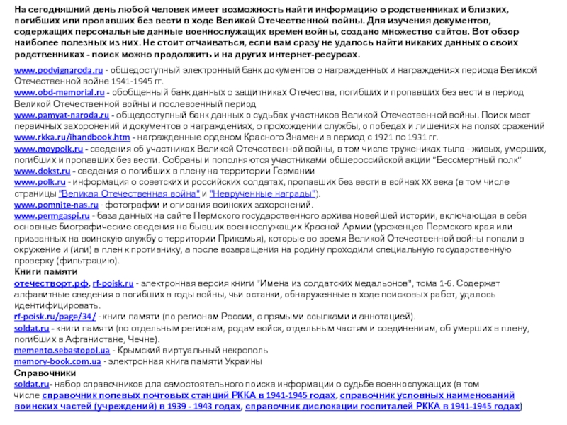 www.obd-memorial.ru - обобщенный банк данных о защитниках Отечества, погибших и пропавших без вести в период Великой Отечественной войны и послевоенный период