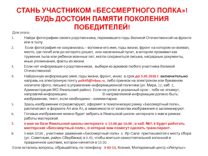 Найденную информацию (имя, годы жизни, фронт, иное) в срок до 5.05.2018 г. включительно направь на электронную почту polk45@inbox.ru, либо принеси на электроном или бумажном носителе (фото, письмо) в управление информационной политики (ул. Мира, 12, каб. 2, Администрация МО Ямальский район). Если не успел в указанный срок – тебе не откажут, направляй информацию. В направляемой информации должно быть: изображение, текст, если необходимо – комментарии.