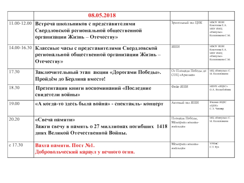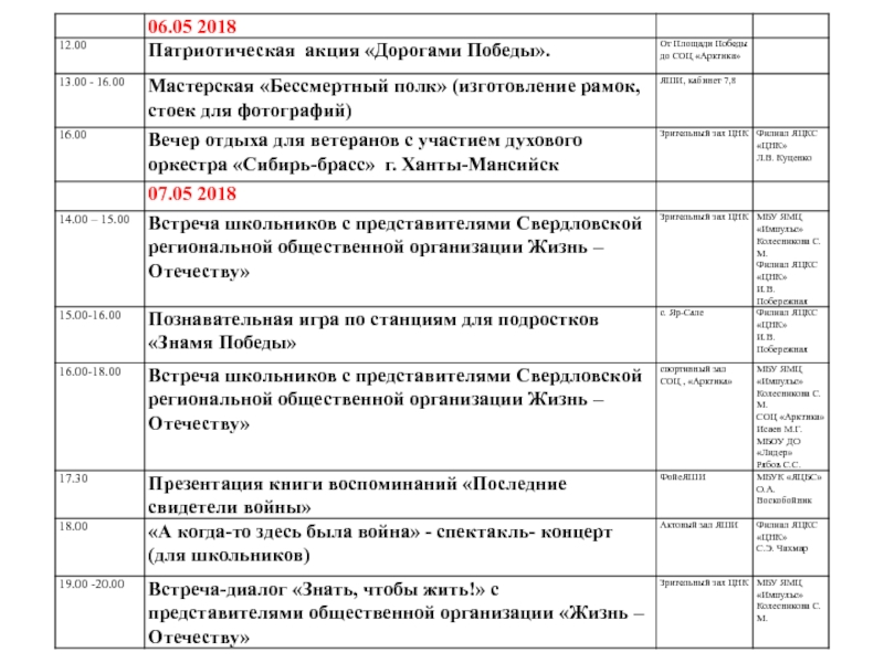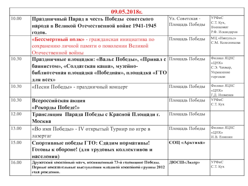 9 мая 2018г., участники движения «Бессмертный полк» с. Яр-Сале приглашаются к месту сбора (ул. Советская, район Сбербанка) в 9.45, чтобы влиться самостоятельной колонной в праздничное шествие, которое начнется в 10.00.