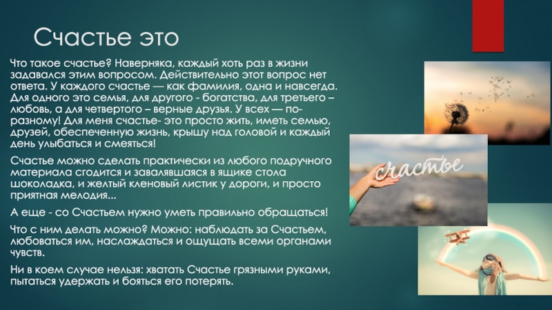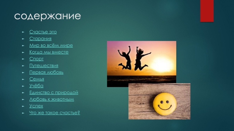 содержаниеСчастье этоСтаранияМир во всём миреКогда мы вместе СпортПутешествияПервая любовьСемьяУчёбаЕдинство с природойЛюбовь к животнымУспех Что же такое счастье?