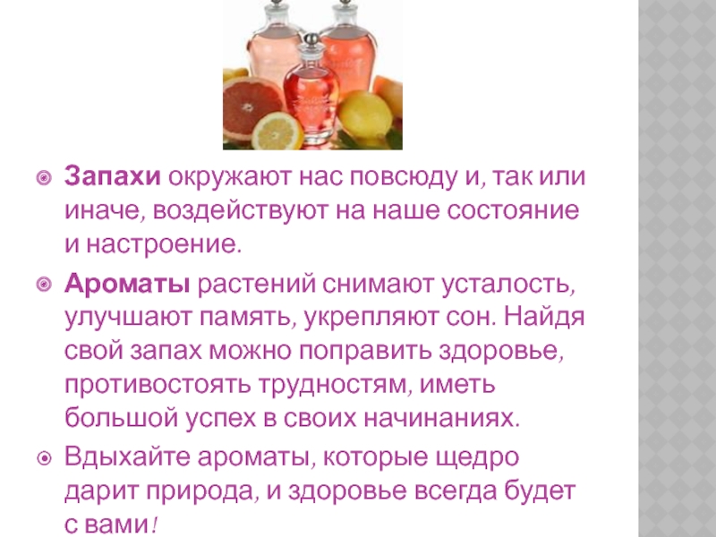 Слайд 9Запахи окружают нас повсюду и, так или иначе, воздействуют на наше состояние