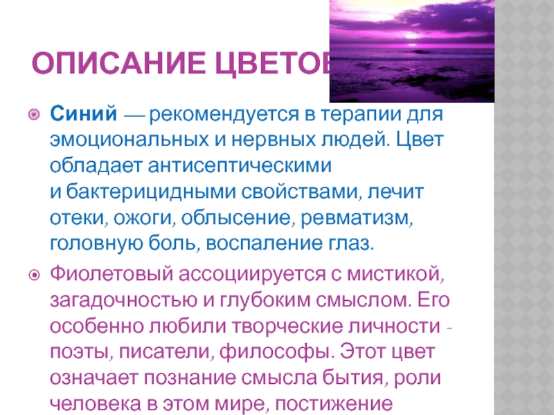 Синий — рекомендуется в терапии для эмоциональных и нервных людей. Цвет обладает