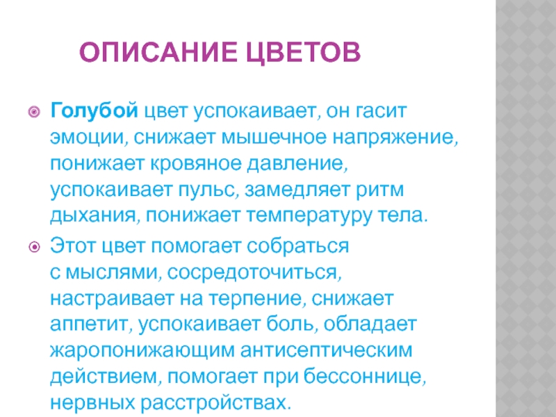 Голубой цвет успокаивает, он гасит эмоции, снижает мышечное напряжение, понижает кровяное