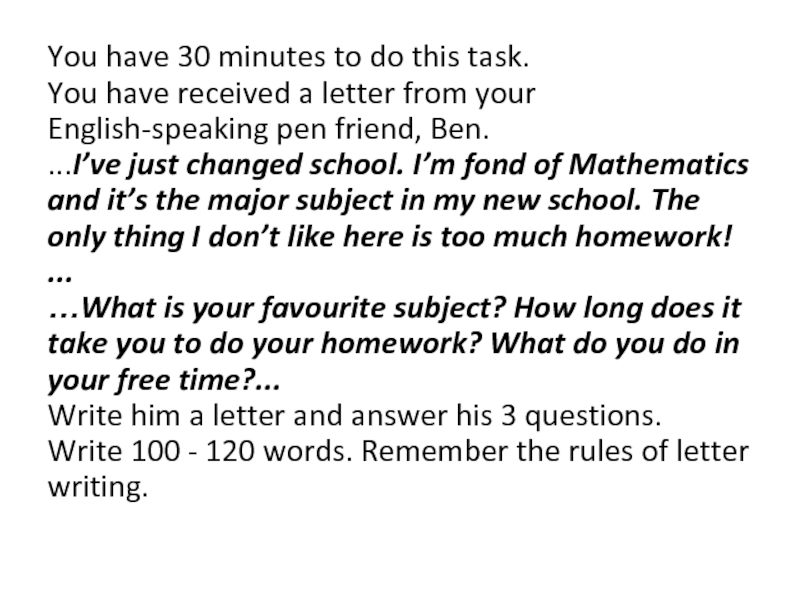 You have 30 minutes to do this task. You have received a letter from your English-speaking pen
