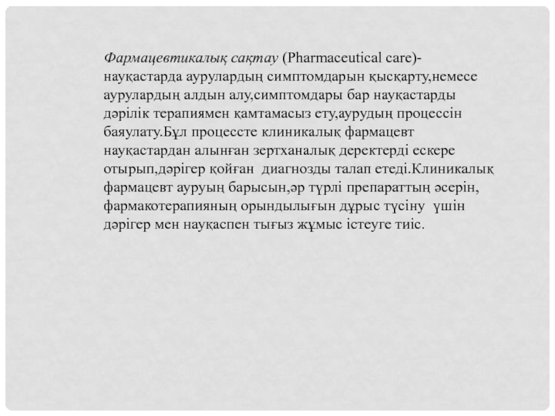 Слайд 3Фармацевтикалық сақтау (Pharmaceutical care)-науқастарда аурулардың симптомдарын қысқарту,немесе аурулардың алдын алу,симптомдары бар