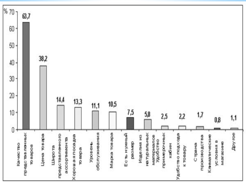 фактором при выборе обуви в магазине для одних является качество товара (63,7%), для других - его цена (38,2%), третьим важна широта предлагаемого ассортимента (14,4%), четвертым - степень удобства обуви (13,3%) и т. д.