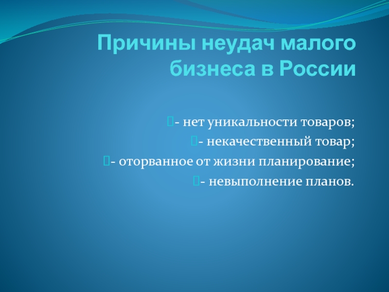 Причины неудач малого бизнеса в России - нет уникальности товаров;- некачественный товар;- оторванное от жизни планирование;- невыполнение планов.