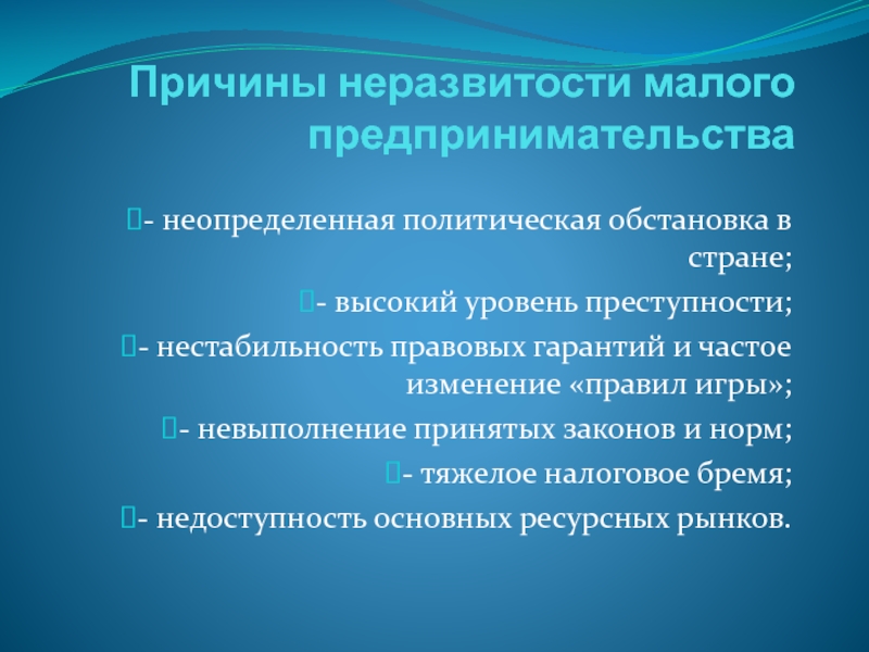 Причины неразвитости малого предпринимательства- неопределенная политическая обстановка в стране;- высокий уровень преступности;- нестабильность правовых гарантий и частое