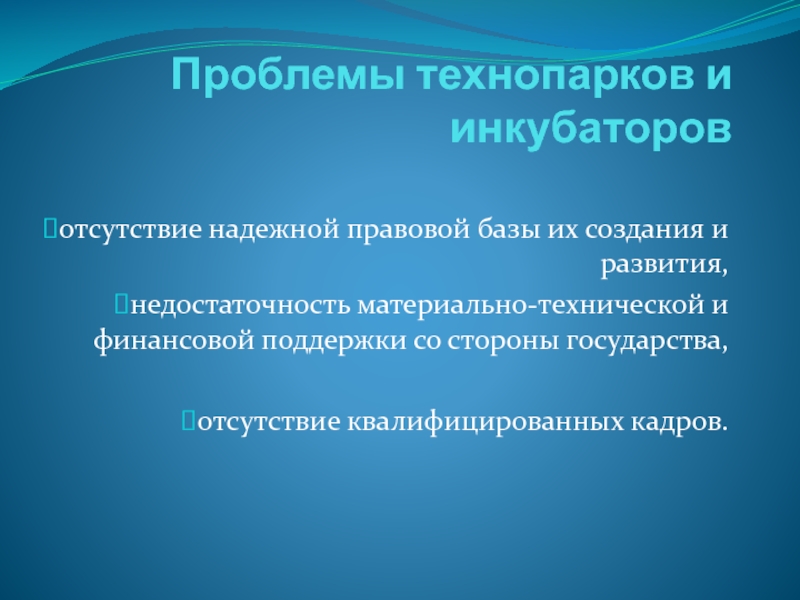 Проблемы технопарков и инкубаторовотсутствие надежной правовой базы их создания и развития, недостаточность материально-технической и финансовой поддержки со