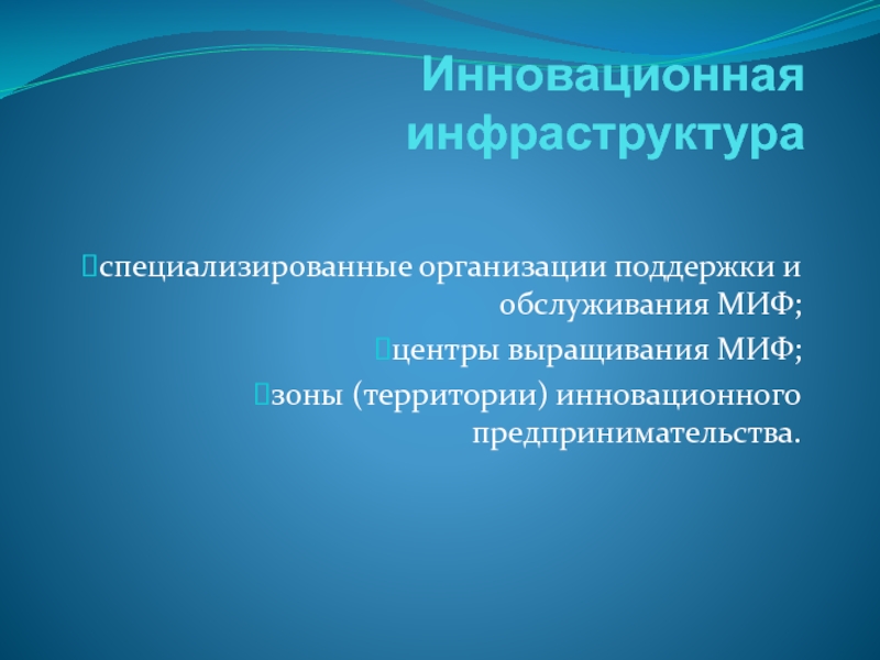 Инновационная инфраструктураспециализированные организации поддержки и обслуживания МИФ;центры выращивания МИФ;зоны (территории) инновационного предпринимательства.