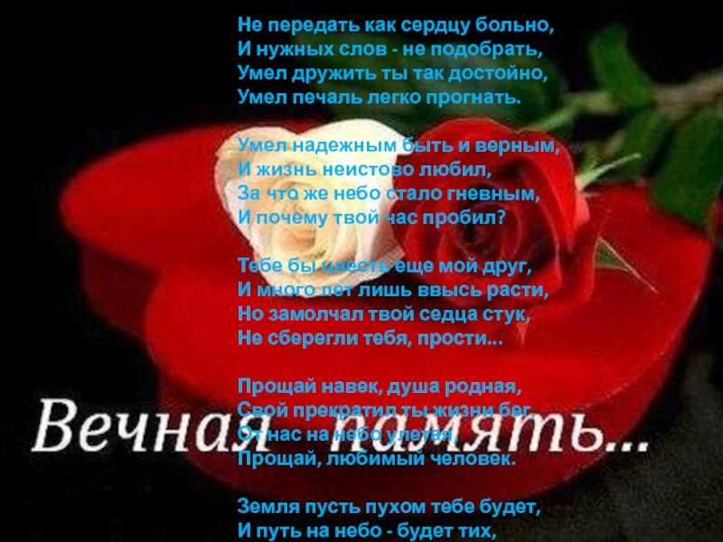 Не передать как сердцу больно, И нужных слов - не подобрать, Умел дружить ты так достойно, Умел