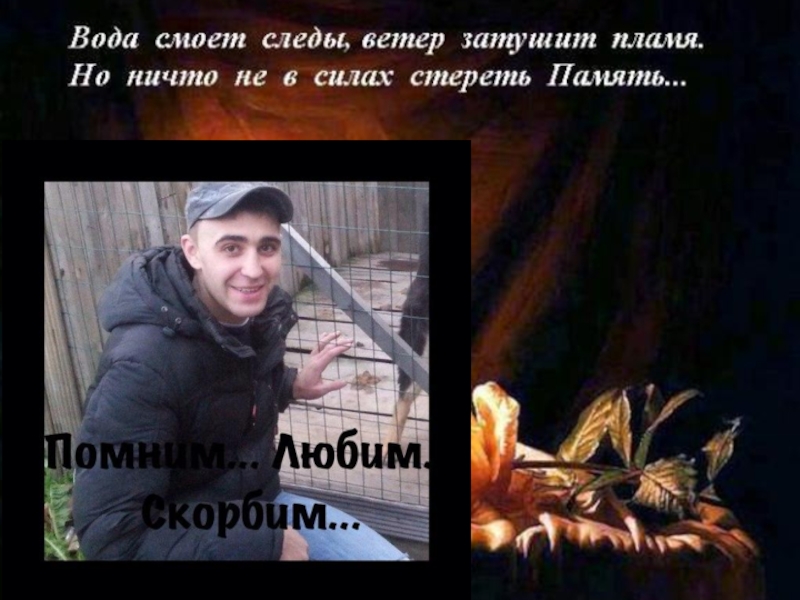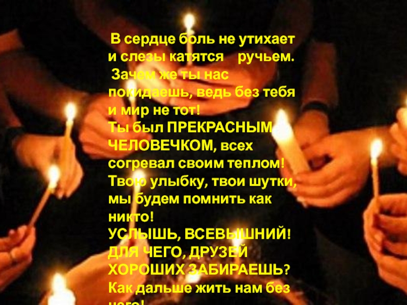 В сердце боль не утихает и слезы катятся ручьем. Зачем же ты нас покидаешь, ведь без тебя и мир не тот!Ты был ПРЕКРАСНЫМ ЧЕЛОВЕЧКОМ, всех согревал своим теплом! Твою улыбку,
