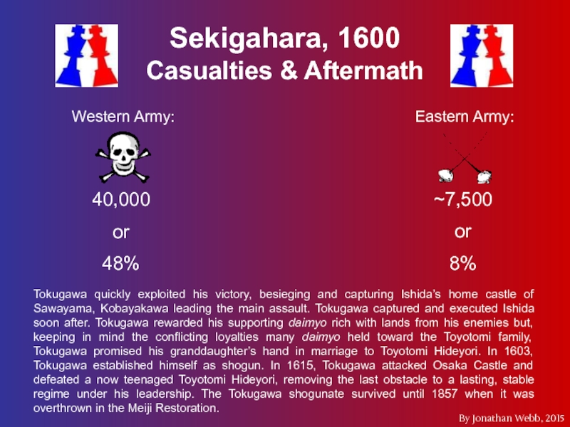 Fighting reaches a critical point in the north: Eastern forces defeat Shima and Goma’s forces, the remnants melting into Ishida’s lines while Shimazu counterattacks Mitsudaira and Il Namosa. Ishida again signals Kobayakawa to hit the Eastern left flank; Otani even tries to prod him to move off Mount Matsuo. Kikkawa observes the signal but also does not move. Instead, Kobayakawa defects and leads his forces against Otani. Otani’s troops fire a deadly volley into Kobayakawa’s lead troops but Otani, already heavily engaged to the front, is overwhelmed and killed.