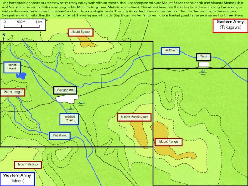 Ukita in a blocking position to the west around Mount Tengu, Kobayakawa further south around Mount Matsuo, and Kikkawa and Mori to the southeast on the other side of Mount Nangu. Ishida plans to draw the Eastern Army into a box around Sekigahara, and then crush it with attacks from all sides.